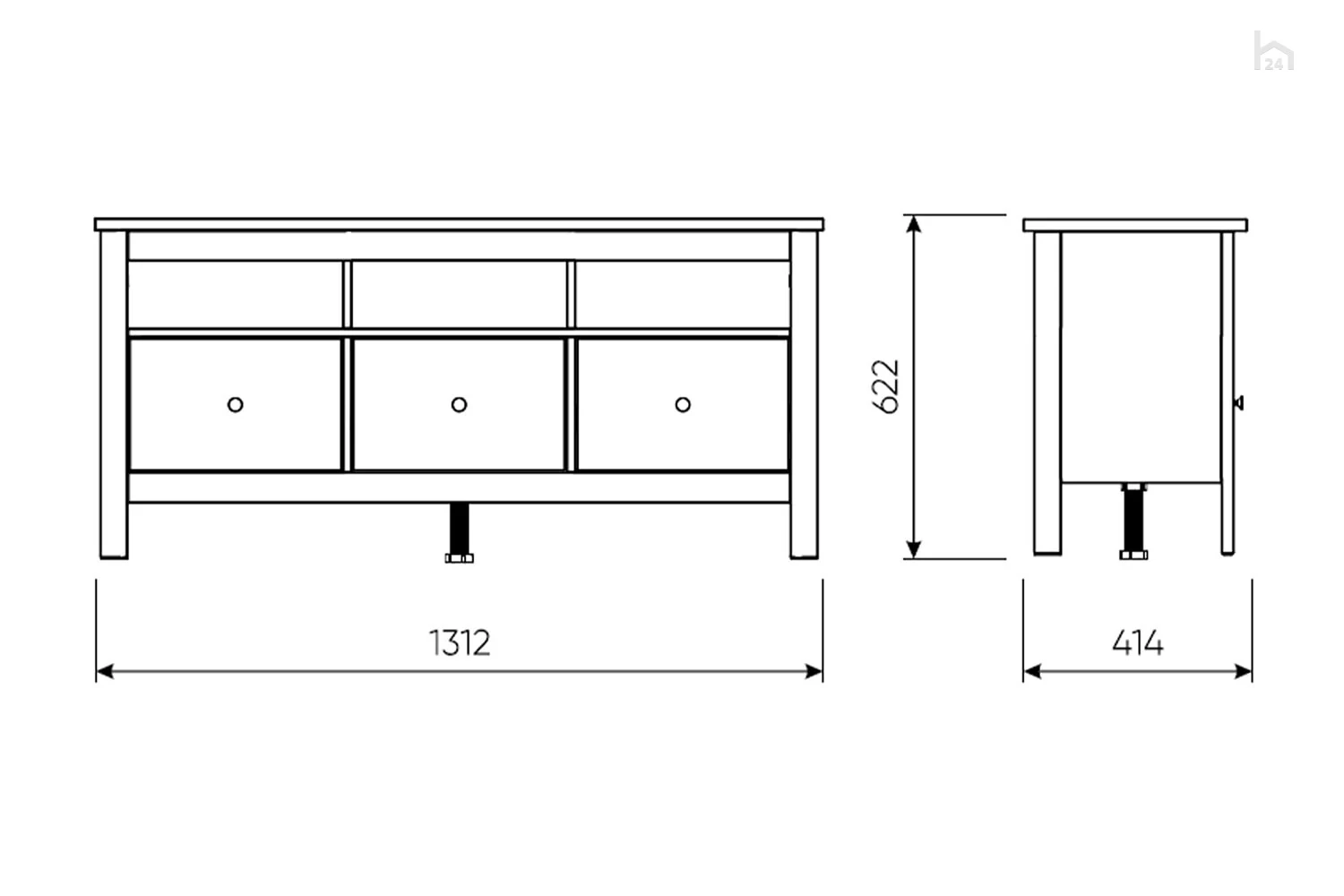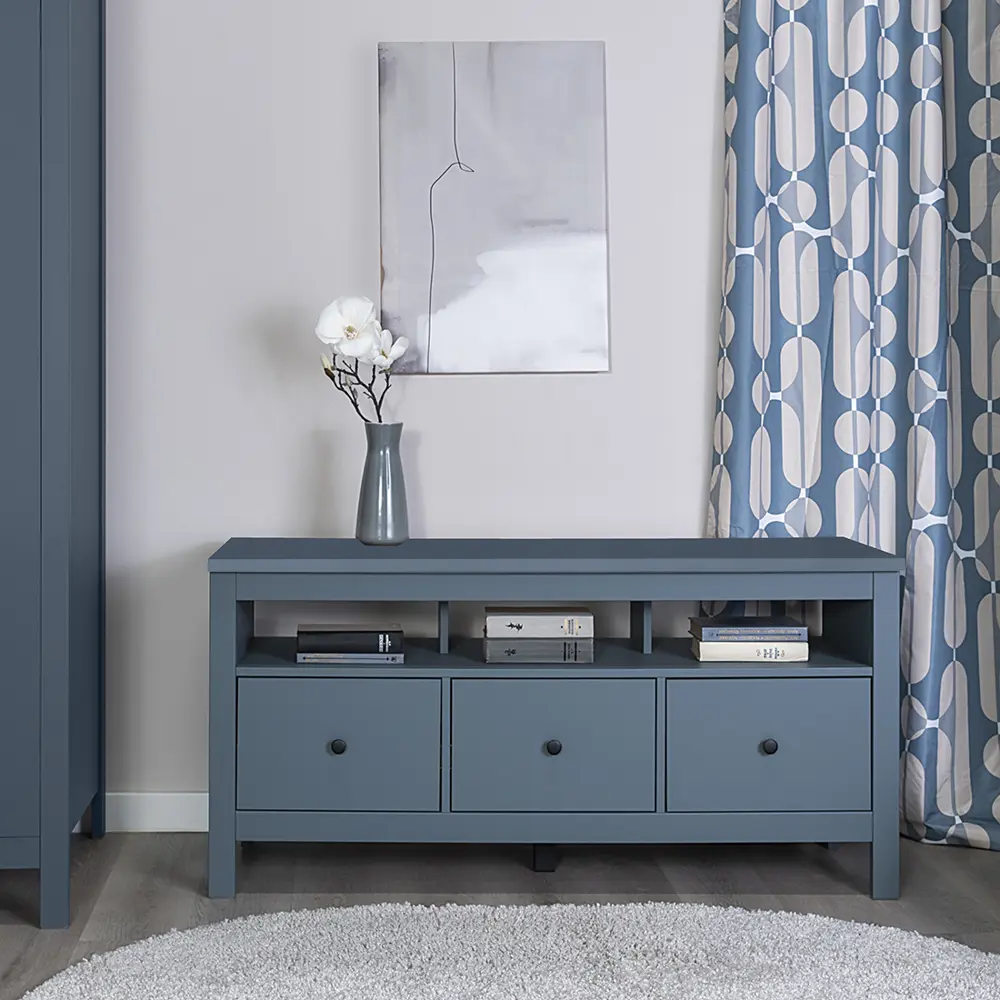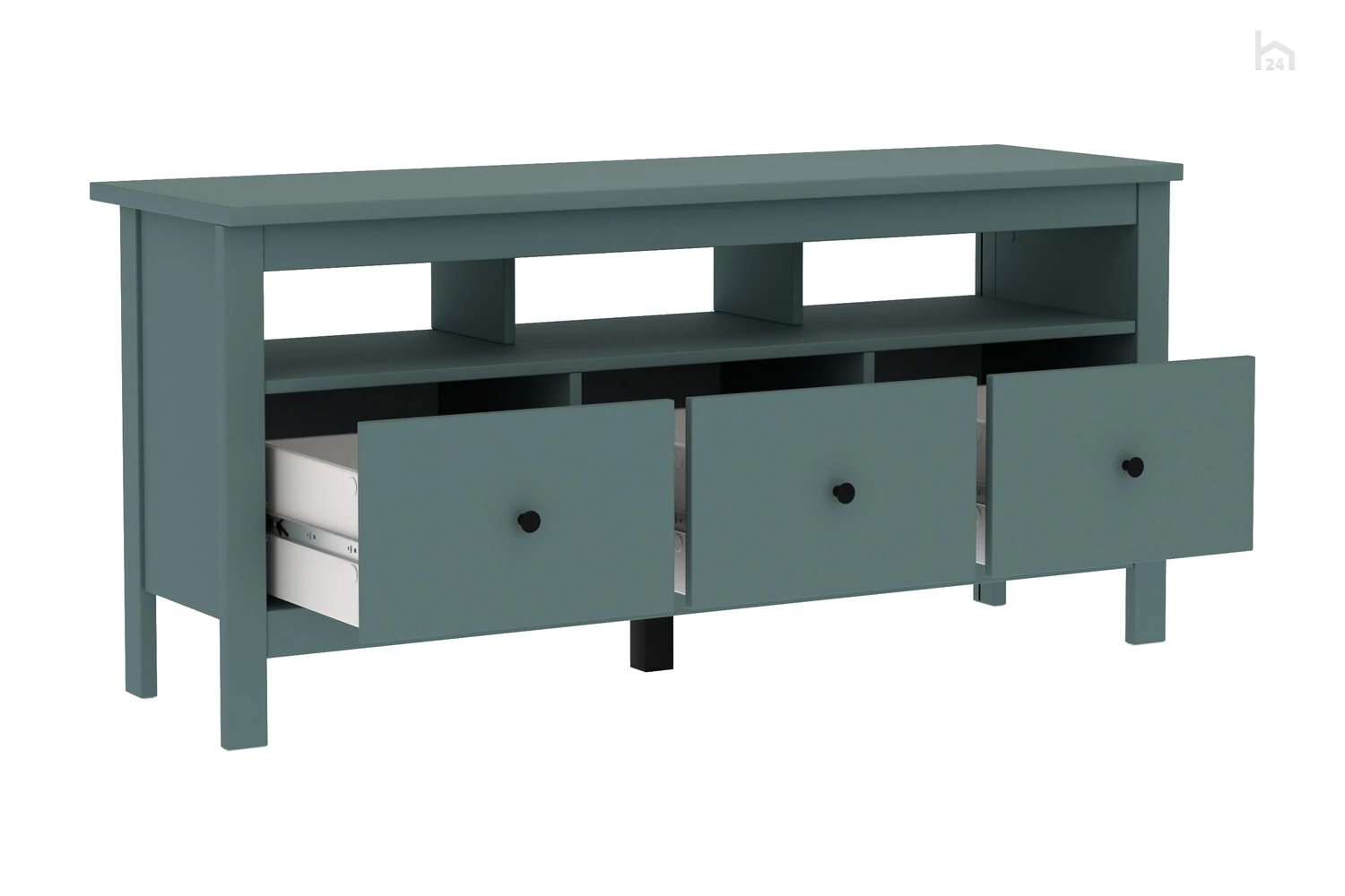 Напольная тумба под ТВ в современном и скандинавском стиле, выполненная в тёмно-бирюзовом цвете. Подходит для гостиной и визуально напоминает мебель в духе ИКЕА. Конструкция прямоугольная, комбинированного типа, с полками и тремя выдвижными ящиками на шариковых направляющих. Каркас, фасады и основание изготовлены из КДСП и ДСП с матовым покрытием. Тумба оснащена металлическими ручками (3 шт.) и устойчивыми ножками. Максимальная нагрузка на полку под ТВ — 15 кг. Габариты тумбы: 131,2×41,4×62,2 см. Вес — 41,28 кг, объём — 0,0884 м³. Гарантия производителя — 24 месяца