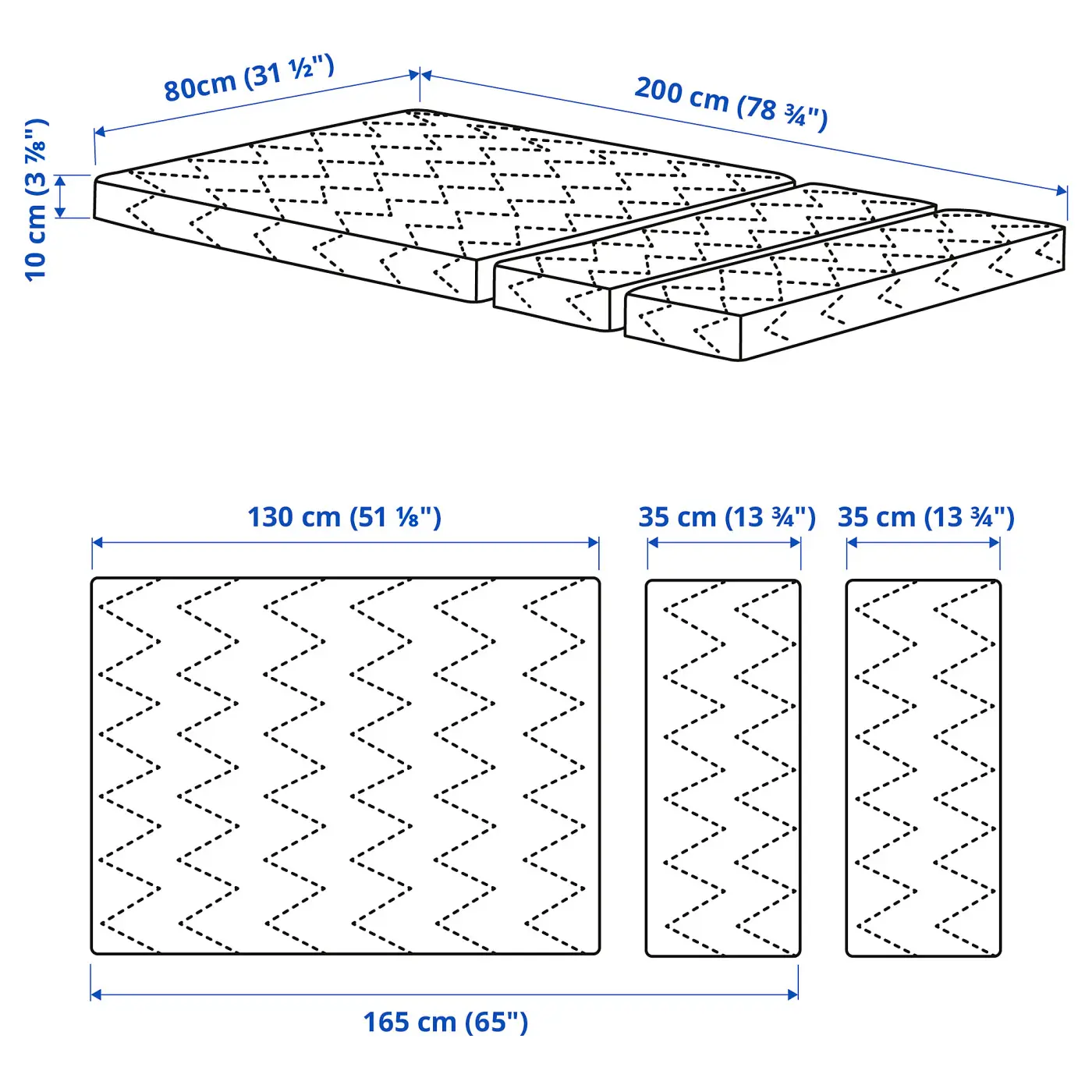 Детский матрас ВИМСИГ — практичное решение для раздвижной кровати. Благодаря продуманной конструкции он увеличивается по мере роста ребёнка: 130 → 165 → 200 см с помощью двух дополнительных секций.