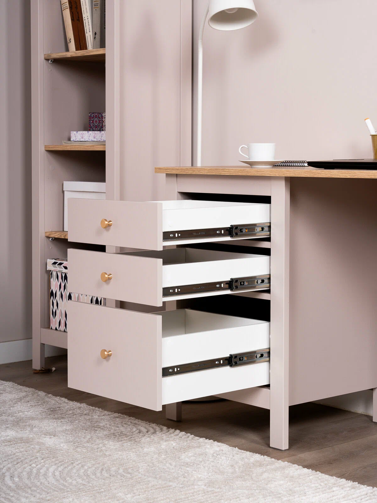 Конструкция стола оснащена тремя вместительными выдвижными ящиками на направляющих полного выдвижения с доводчиками. Они открываются плавно и бесшумно, обеспечивая удобный доступ к содержимому. В ящиках легко разместить канцелярию, документы, учебники и другие необходимые мелочи, поддерживая порядок на рабочем месте.