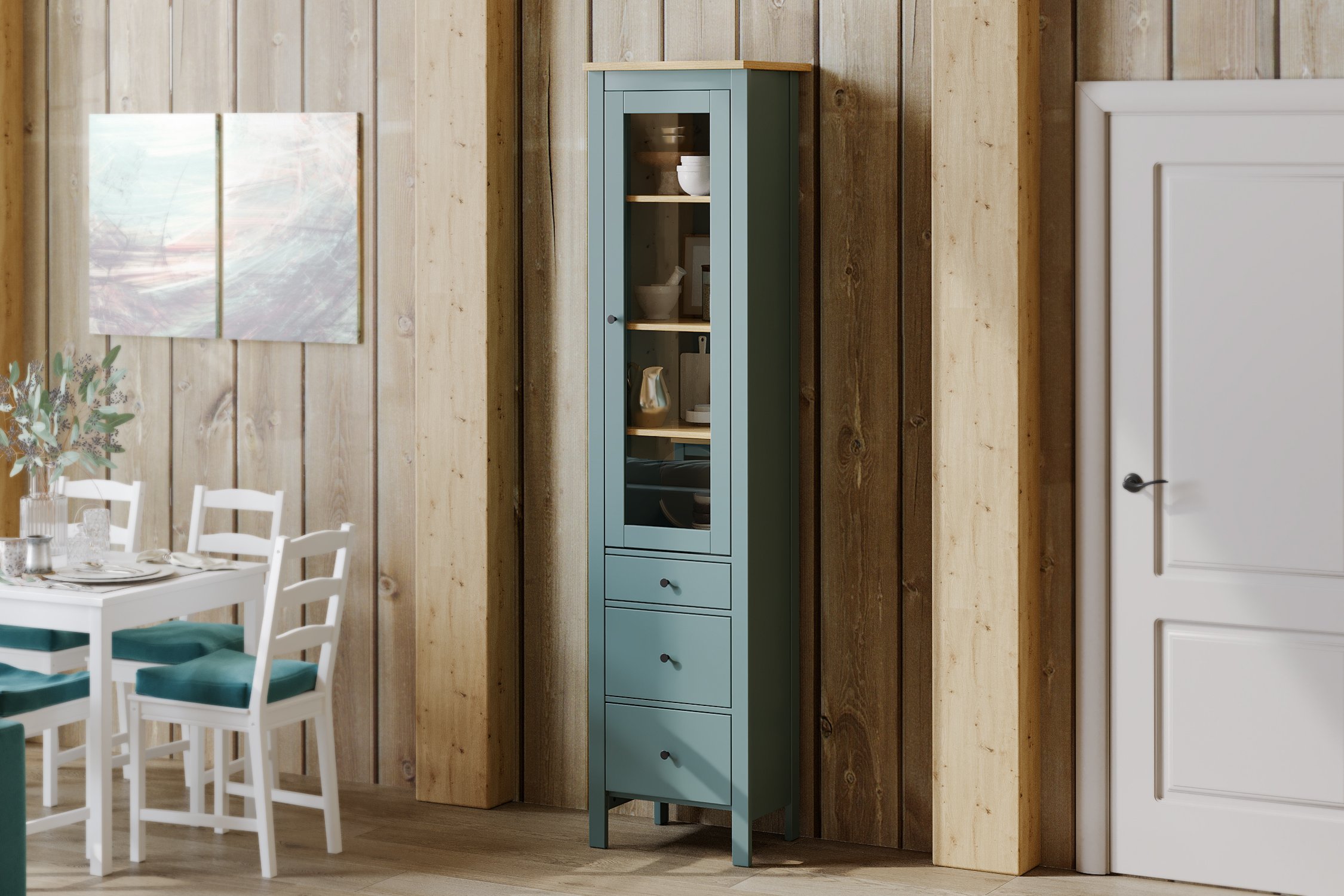 Шкаф САГА с витриной выполнен в выразительном сочетании тёмно-бирюзового оттенка и декора под ясень, что делает его заметным акцентом в интерьере и при этом сохраняет спокойный, современный характер оформления. Модель хорошо вписывается в скандинавский и современный стили.