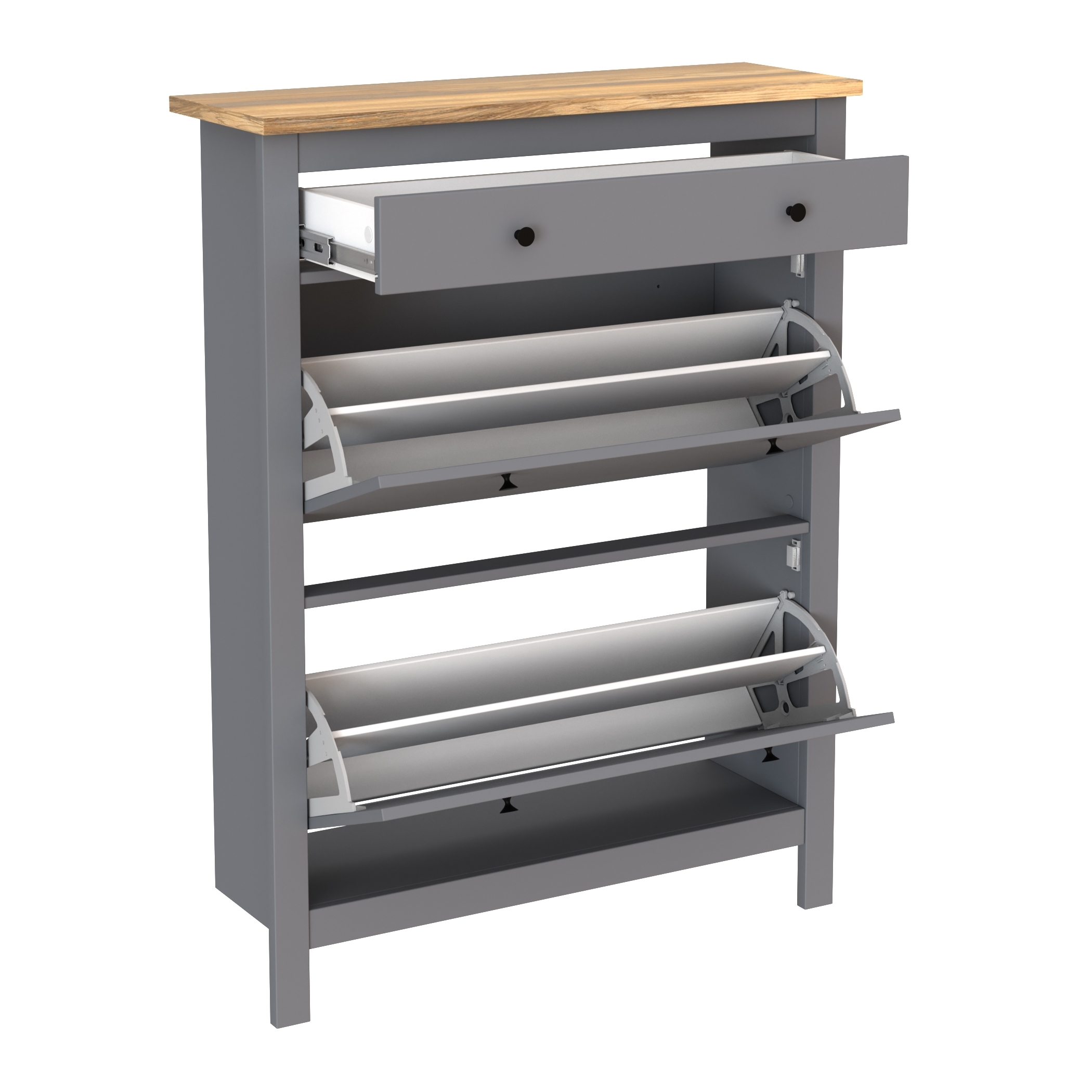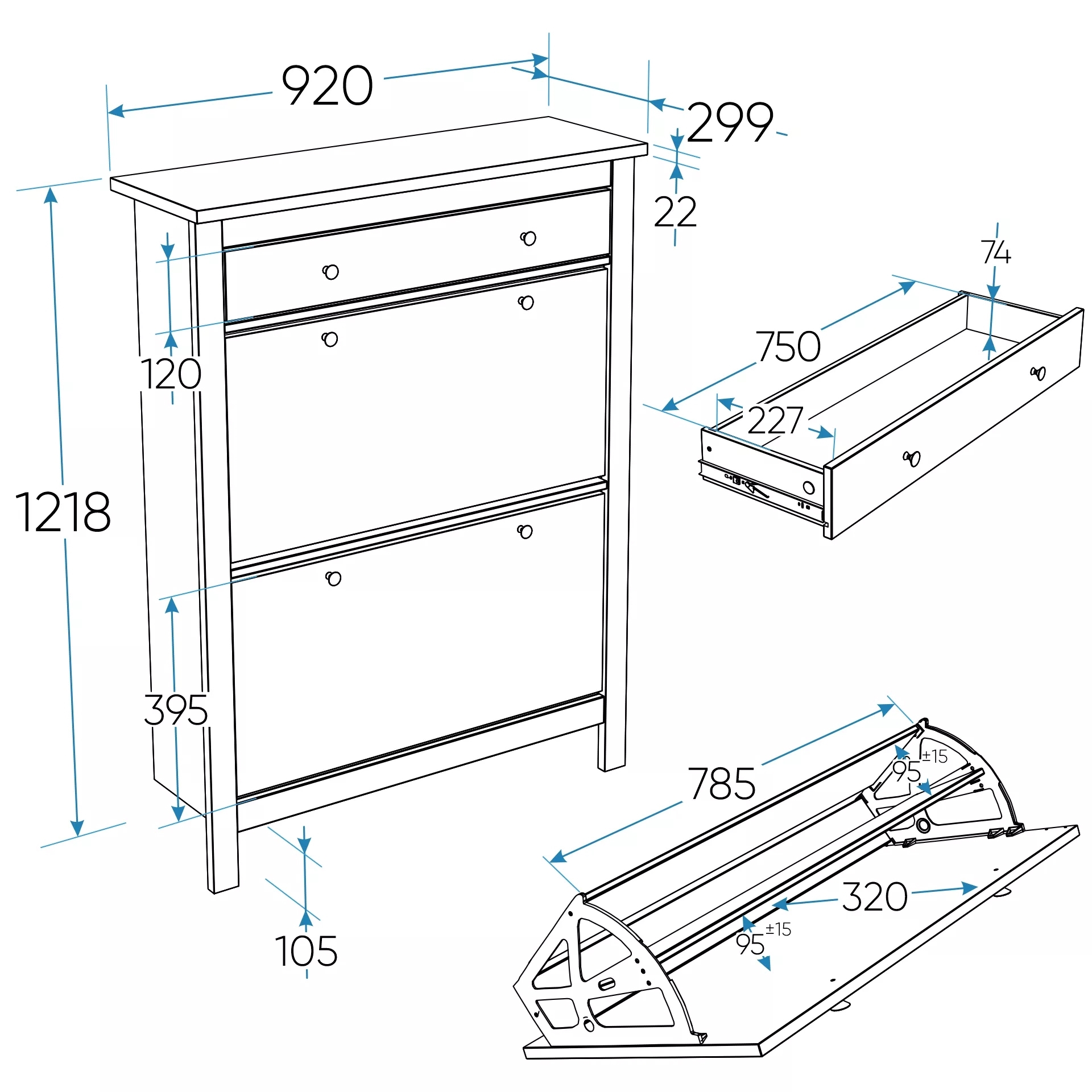 Конструкция включает небольшой выдвижной ящик для хранения ключей, аксессуаров для ухода за обувью и других мелочей, а также два откидных отделения для обуви, каждое из которых вмещает до 4 пар, всего — до 8 пар обуви. Надёжные магнитные фиксаторы предотвращают самопроизвольное открывание и обеспечивают безопасное использование.
