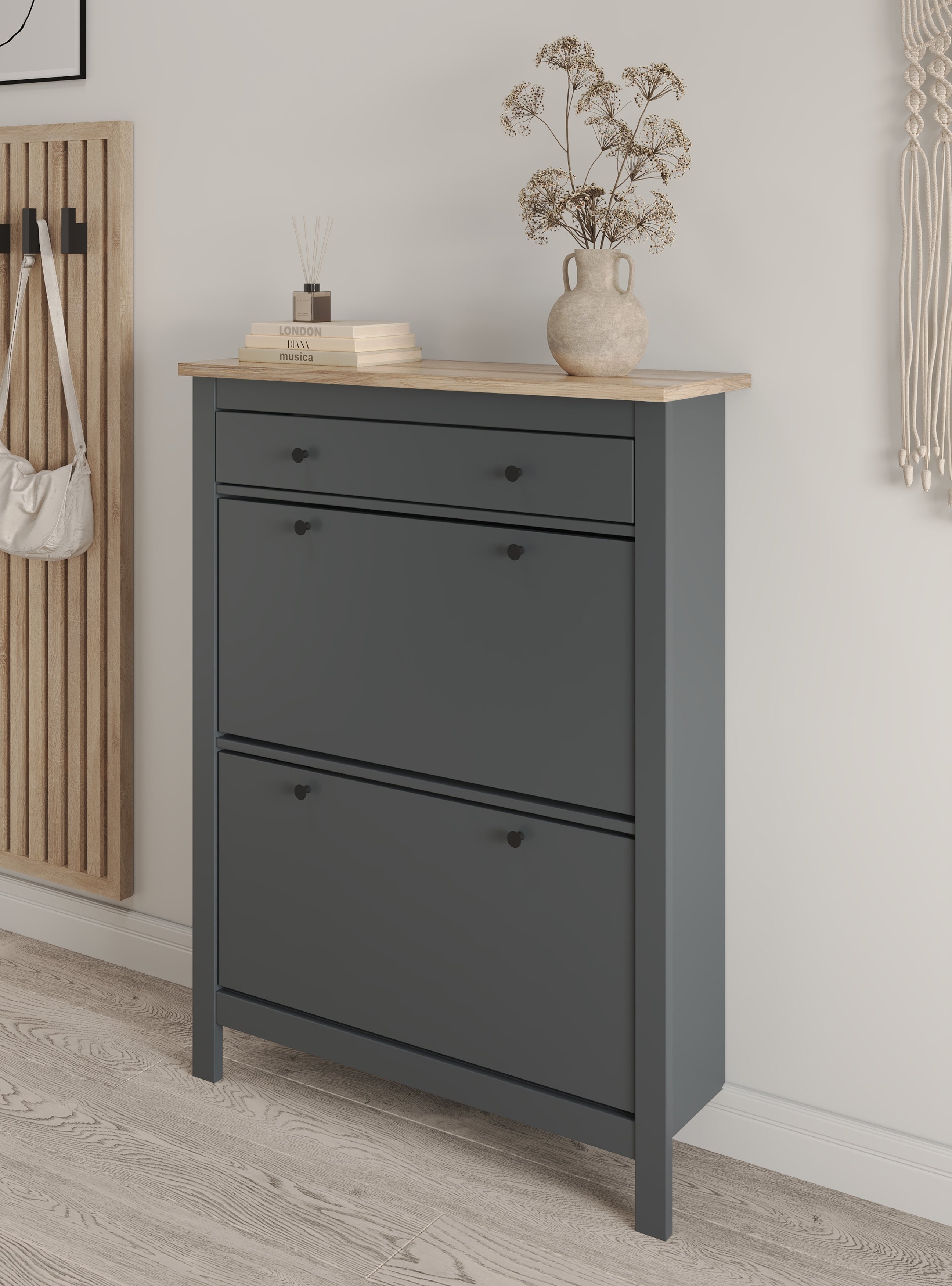 Светлый оттенок серого ясеня с древесной текстурой придаёт мебели спокойный и универсальный внешний вид. Такой цвет визуально делает пространство легче и хорошо сочетается с большинством оттенков интерьера — от светлых скандинавских до более контрастных современных решений. Компактные размеры позволяют разместить обувницу даже в небольшой прихожей, сохраняя удобство и порядок.