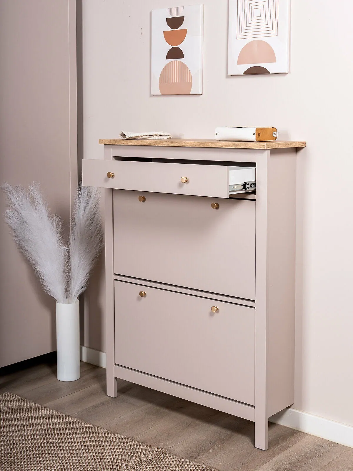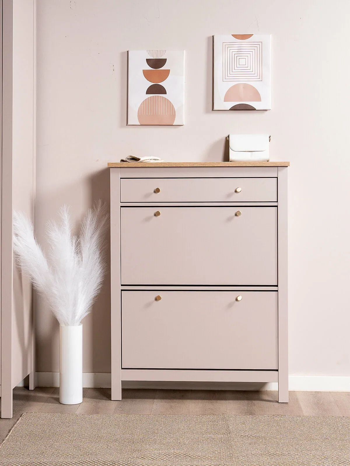Комбинация цвета кашемир и декора под ясень придаёт мебели лёгкость и естественность, благодаря чему обувница гармонично вписывается как в современные, так и в классические интерьеры. Компактные размеры позволяют разместить тумбу даже в небольшой прихожей, сохраняя порядок и удобство хранения.