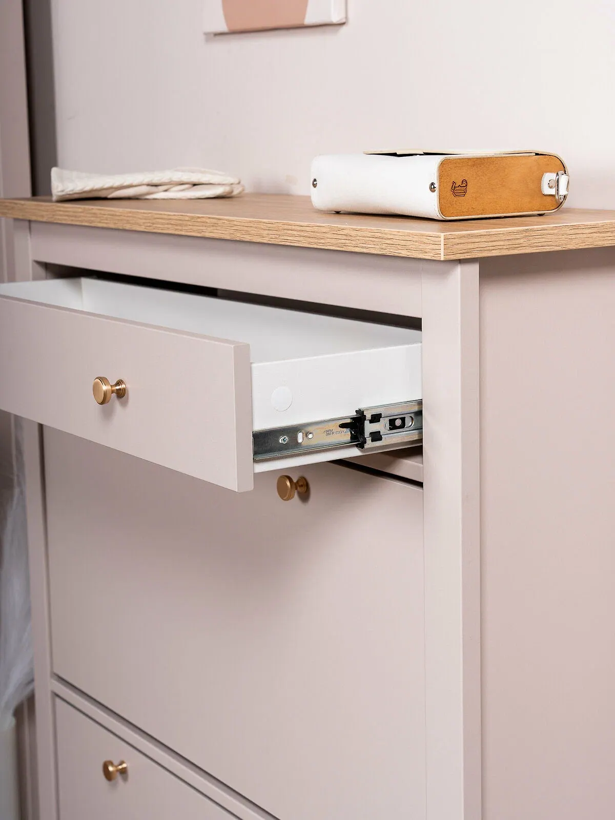 Ящик оснащён направляющими полного выдвижения с доводчиками, благодаря чему открывается плавно и бесшумно. На верхней поверхности тумбы удобно размещать декоративные предметы, сумку или ключи.