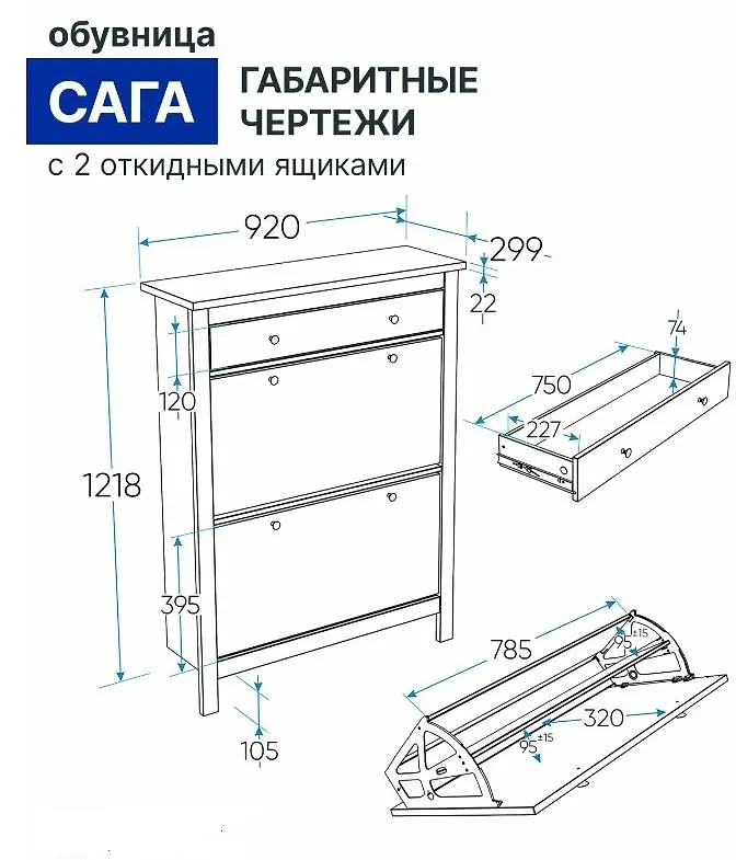 Конструкция включает небольшой выдвижной ящик для хранения ключей, аксессуаров для ухода за обувью и других мелочей, а также два откидных отделения для обуви, каждое из которых вмещает до 4 пар, всего — до 8 пар обуви. Надёжные магнитные фиксаторы предотвращают самопроизвольное открывание и обеспечивают безопасное использование.