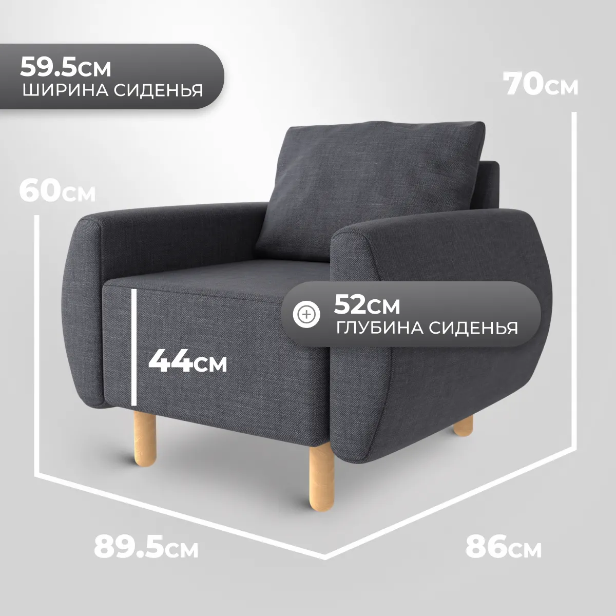 Кресло с деревянным каркасом — элегантное дополнение к любому интерьеру. Светлый цвет каркаса гармонично сочетается с темно-серой обивкой, создавая сдержанный и стильный акцент в помещении.