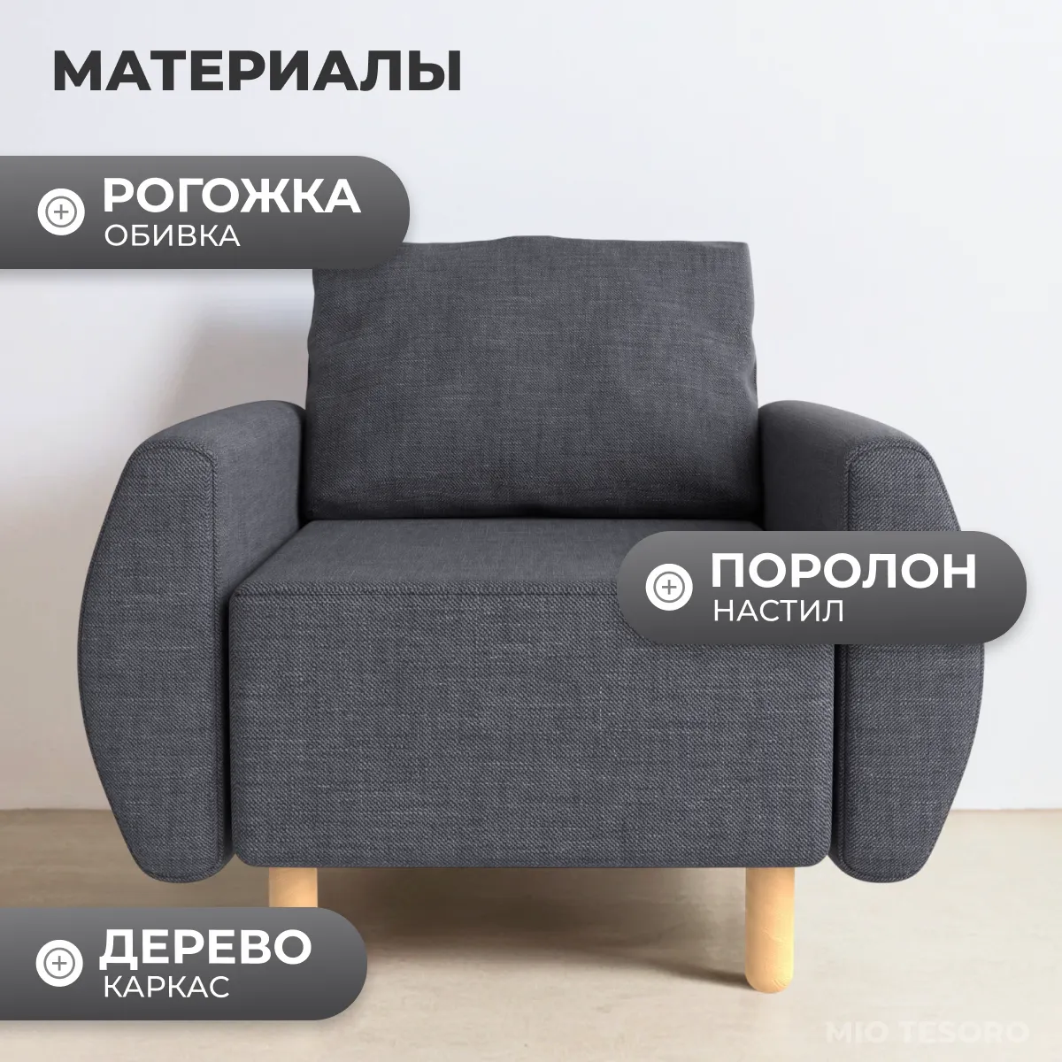 Обивка из прочной рогожки в темно-сером оттенке.